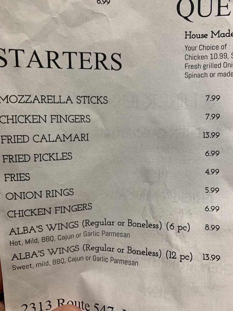 Welcome to ALBAs Restaurant, a hidden gem located at 2313 Hwy 547 in Lakehurst, NJ, where New American cuisine meets a vibrant pub atmosphere. The restaurant's diverse menu features an enticing array of options, from savory pizzas to fresh seafood, ensuring there's something for everyone.